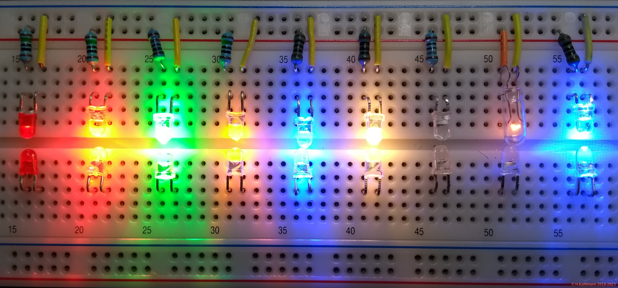 In Bild 1 sind meist LEDs gleicher Farbe gegenübergestellt. An den Positionen: