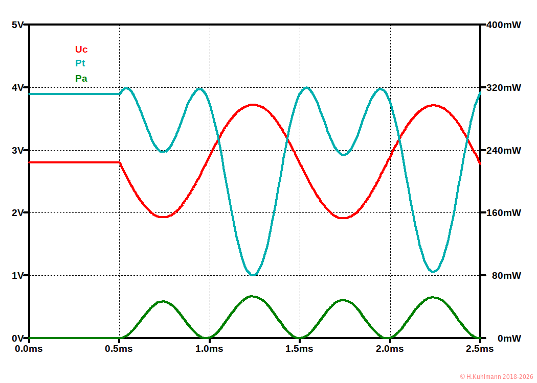 Die Leistung am Ausgang ist geringer und verläuft mit der doppelten Frequenz der Ausgangsspannung.