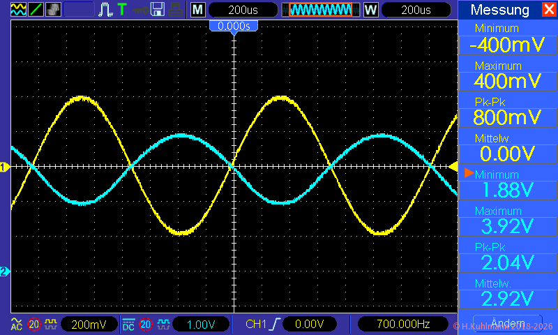 - Die Ausgangswechselspannung (blau) liegt bei 2,04Vss.