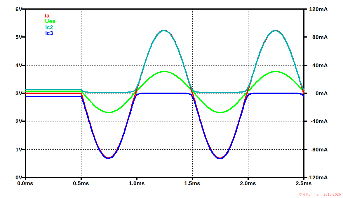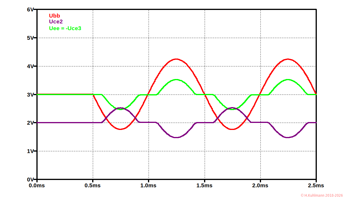 Erst dann, wenn die Ubb des PNP-Transistors Q3 um 0,7 V niedriger als die Emitterspannung Uee ist, fließt ein Strom in Q3 (bei 0,6ms).