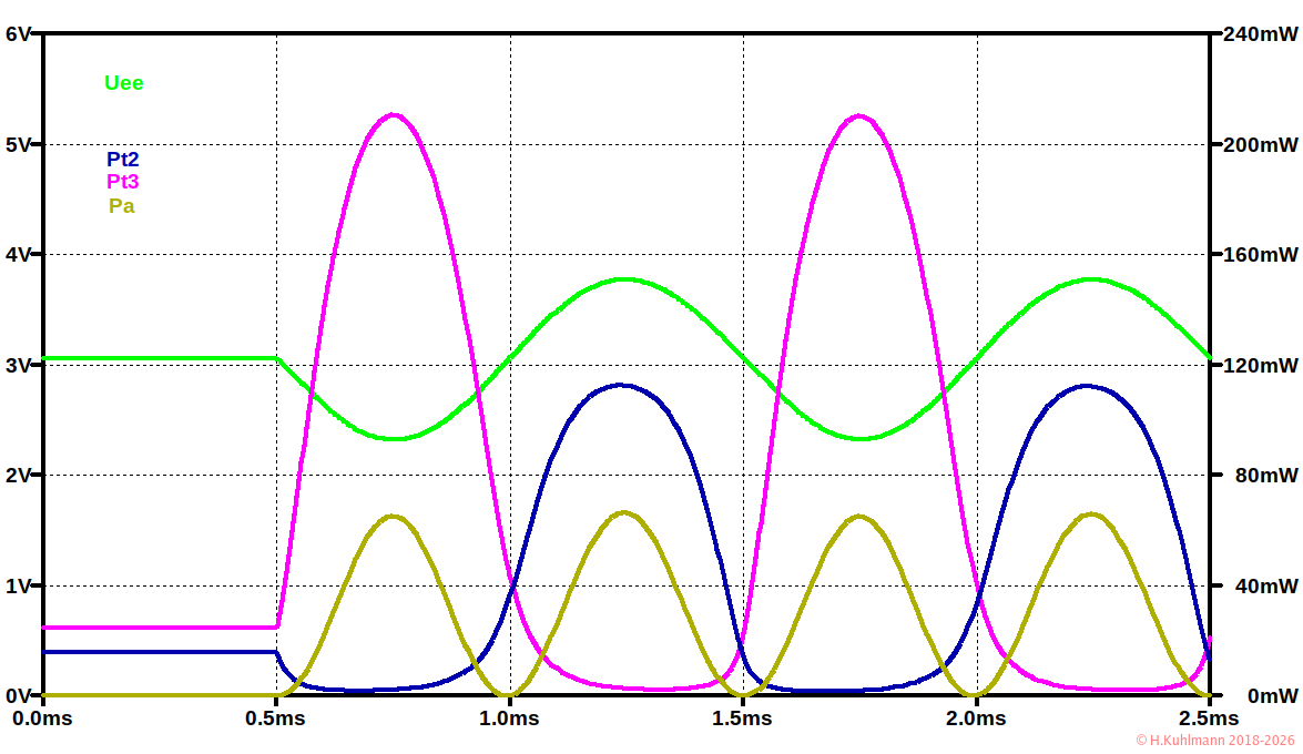 Die am Transistor abfallende Leistung hat ebenfalls eine doppelt so hohe Frequenz wie die Kollektorspannung. Am wichtigsten ist jedoch, dass die am Transistor abfallende Leistung geringer wird, wenn die Kollektorspannung den Arbeitspunkt verlässt. Sie ist am geringsten, wenn die Kollektorspannung hoch ist.