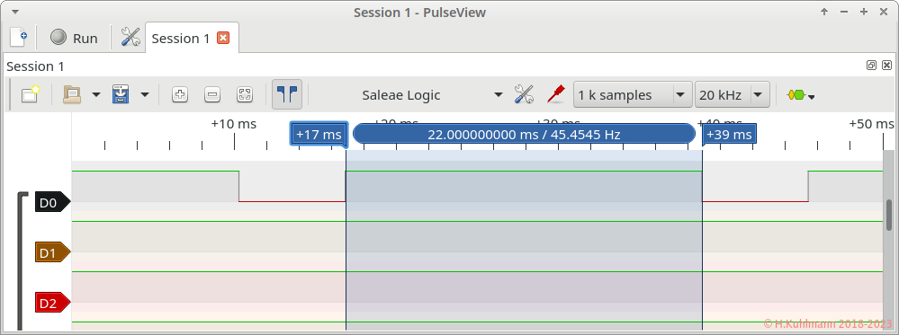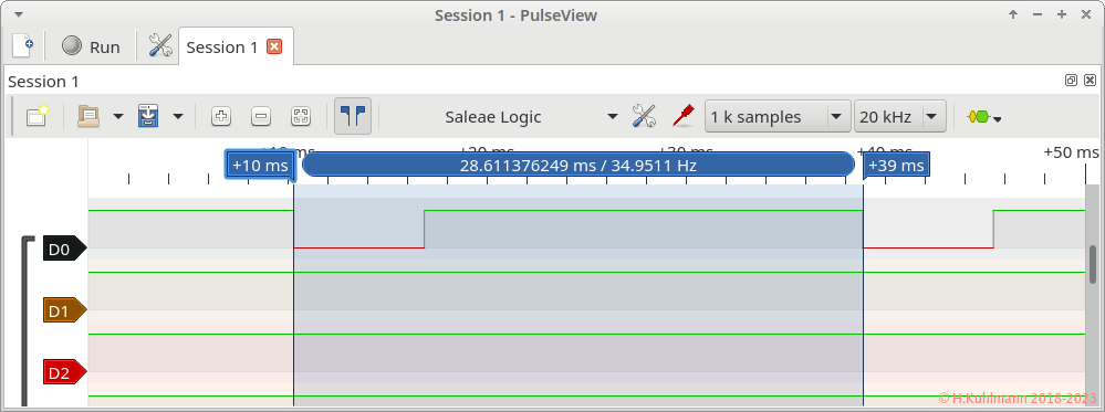 Das Programm PulseView wird gestartet und auf 1k Samples und 20 kHz eingestellt.