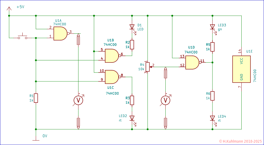 U1B liefert den LOW-Pegel am Ausgang unter Last. U1C liefert den HIGH-Pegel. Um wie viel weicht der HIGH-Pegel von der Versorgungsspannung Uv ab? Das messen wir am besten zwischen Uv und Pin6 des 74HC00.