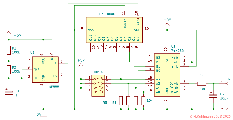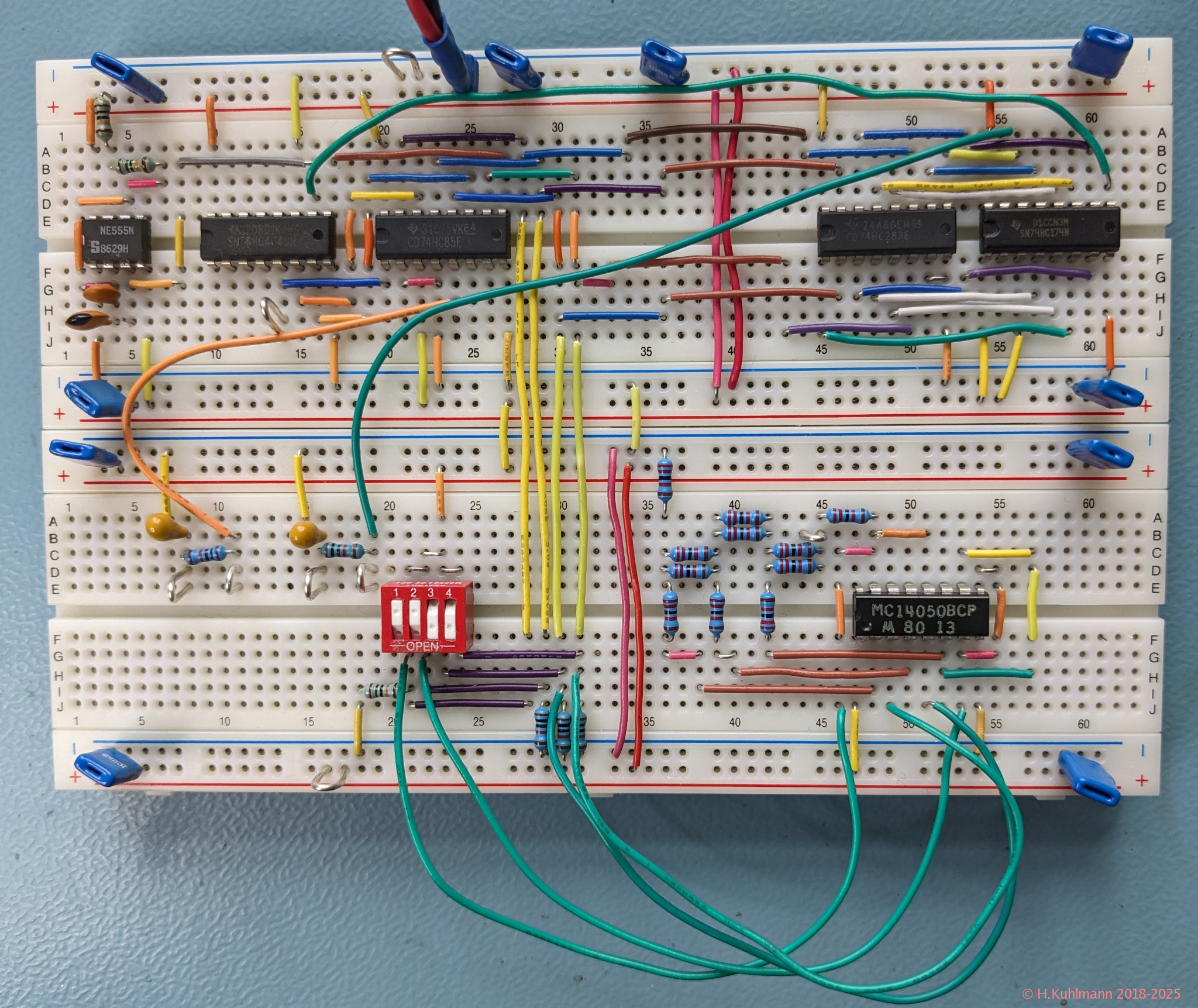 Oben links befindet sich der Taktgenerator mit dem Timer-555. Für den Kondensator C1 wurden zwei Kondensatoren parallel geschaltet, damit die Periode des Puls-Weiten-DAC 16 * 200µs beträgt.