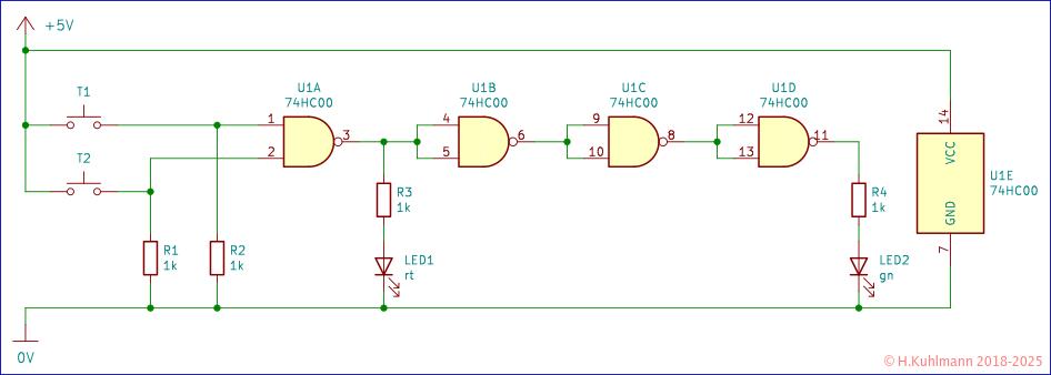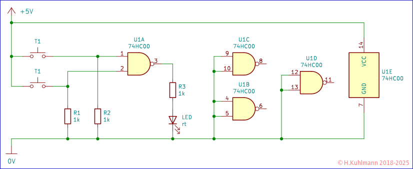 Wenn T1 betätigt wird, wird der Eingang 1 des 74HC00, des NAND-Gatters UA1, auf Plus gelegt, wodurch eine logische 1 entsteht.