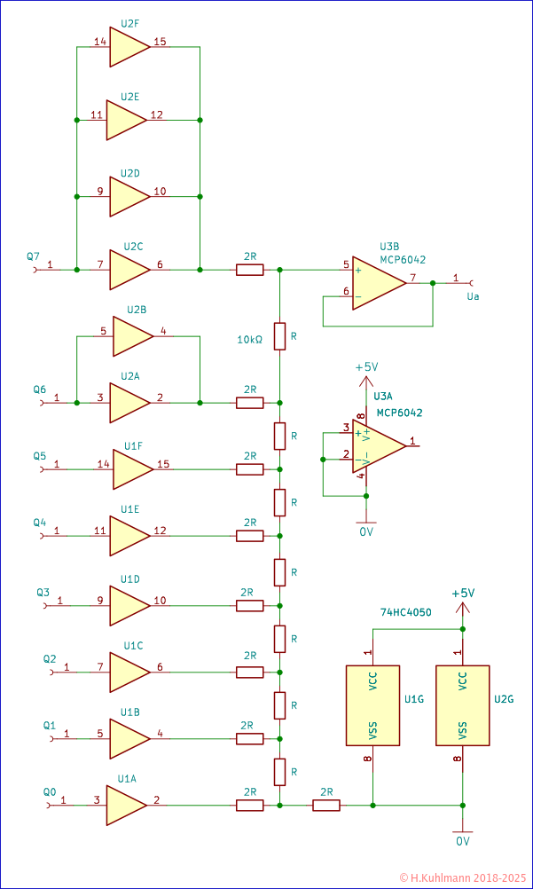 - Wenn wir mehrere Treiber 74HC50 oder 74HC49 für die höherwertigen Bits parallel schalten, können wir R2R-Widerstands-Netzwerke mit kleineren Widerständen verwenden.