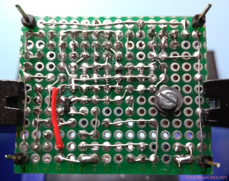 Der Aufbau ist für Lötanfänger nicht ganz einfach, aber machbar. Der MOSFET IRLM6402 und der Doppeltransistor BCV62B haben winzige SMD-Gehäuse für die Oberflächenmontage. Sie werden geschickt zwischen vier Lötpunkte gesetzt. Die SMD-Widerstände R25, R102, R203, R204, R205, R502, R503, R504 und R505 lassen sich etwas einfacher zwischen zwei Lötpunkte setzen. Wie einfache SMD-Bauelemente auf eine Lochrasterplatine gelötet werden, wird im Folgenden ausführlich beschrieben.