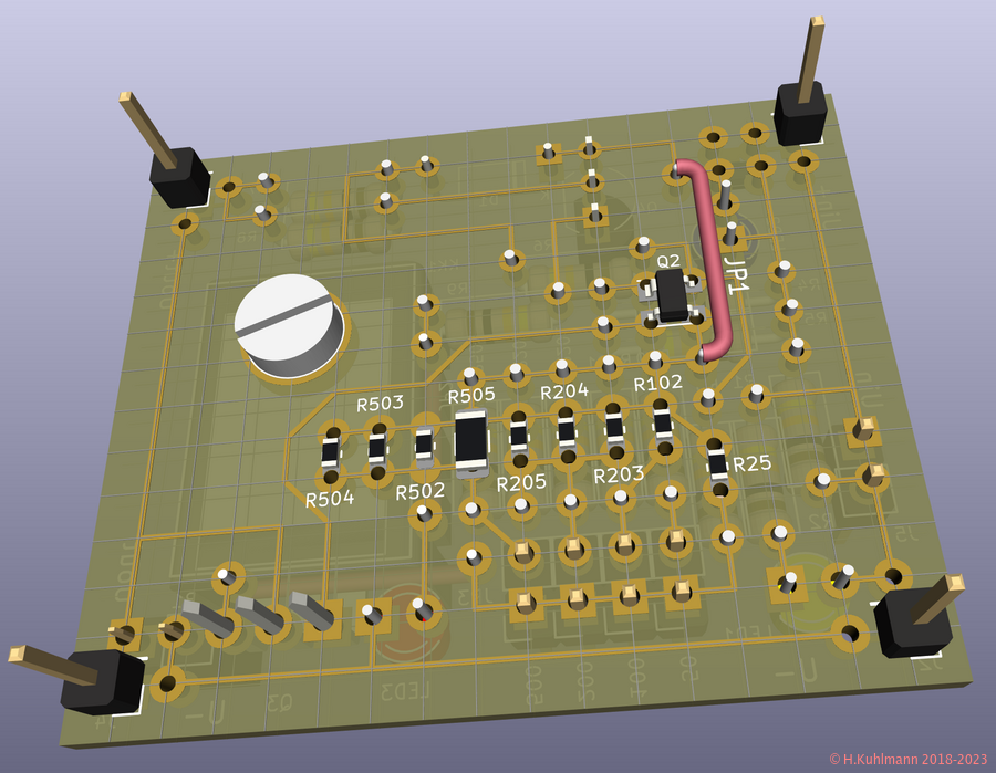 Der Prototyp wurde auf einer Lochrasterplatine mit durchkontaktierten Lötpunkten aufgebaut.