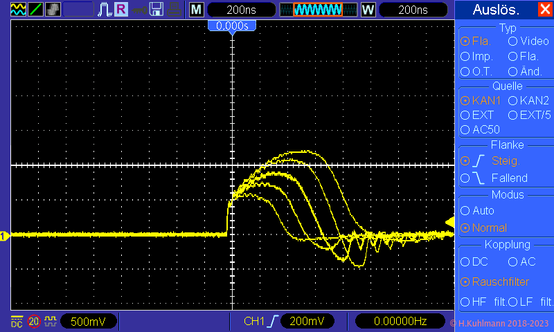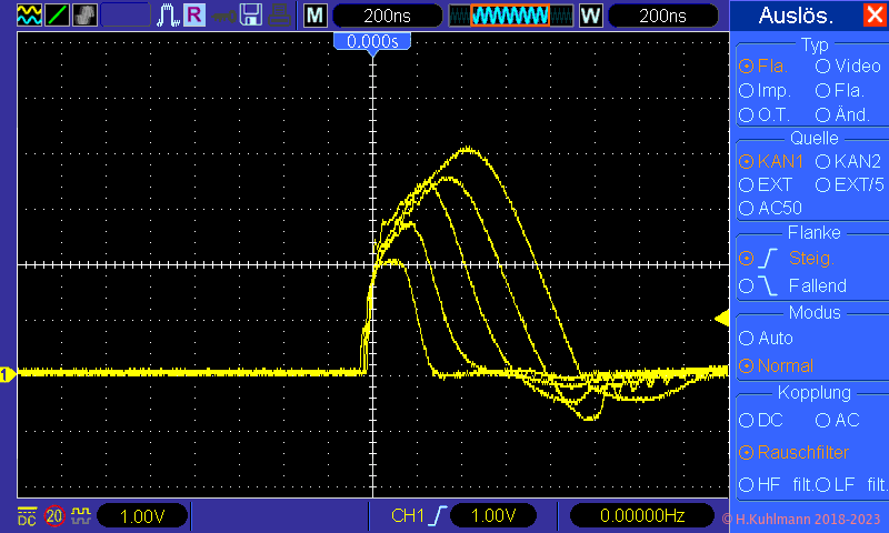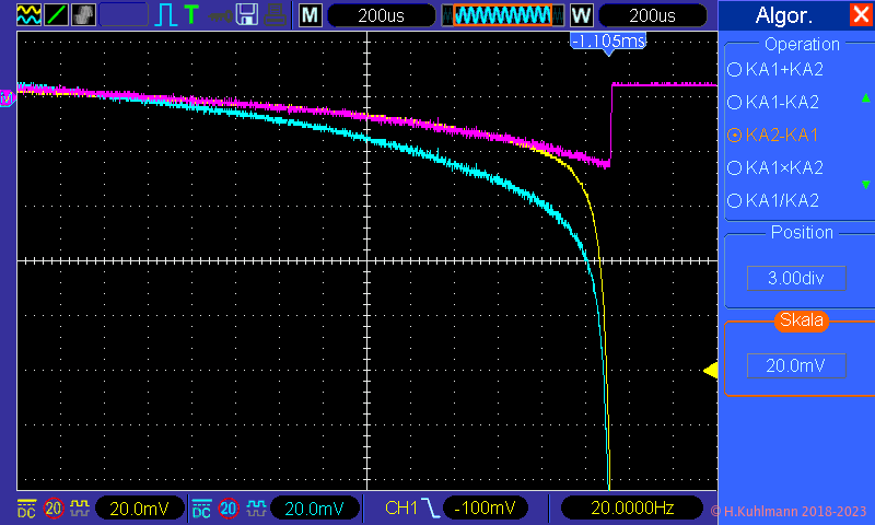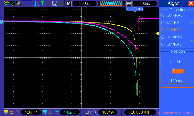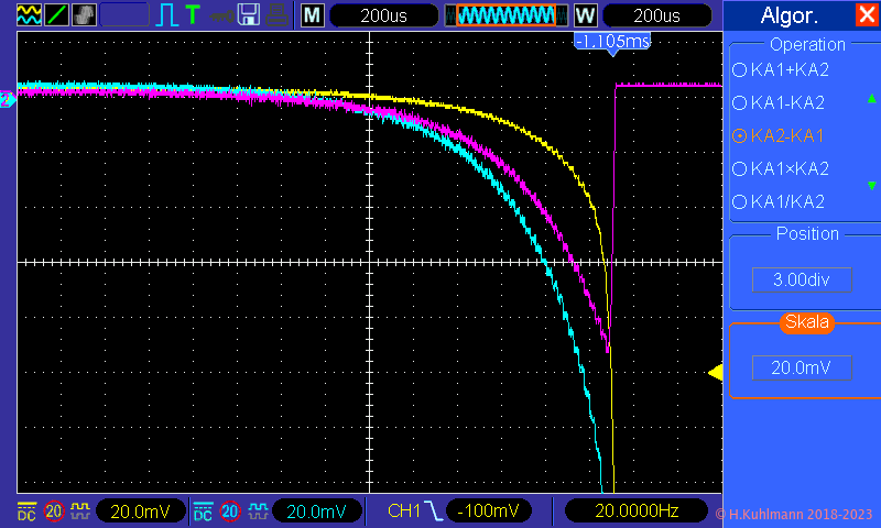 Die Spannung am Messwiderstand R1 wird im Oszilloskop durch die Subtraktion der beiden Kanäle gebildet: U1 = Uk2 - Uk1. Der Strom ist dann einfach Isi = U1 / R1, d. h., die Spannung an R1 in mV entspricht dem Strom Isi in mA.
