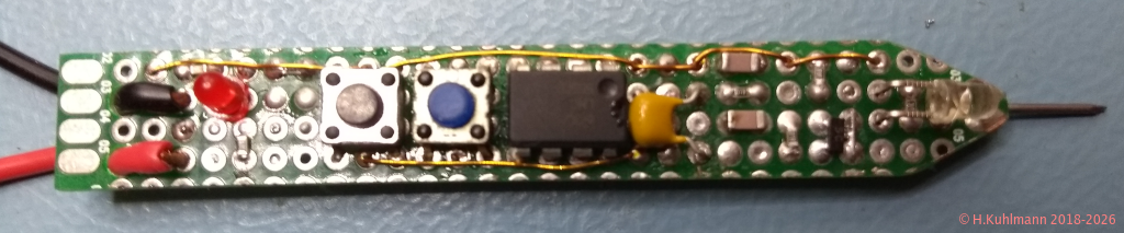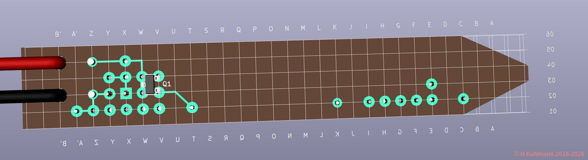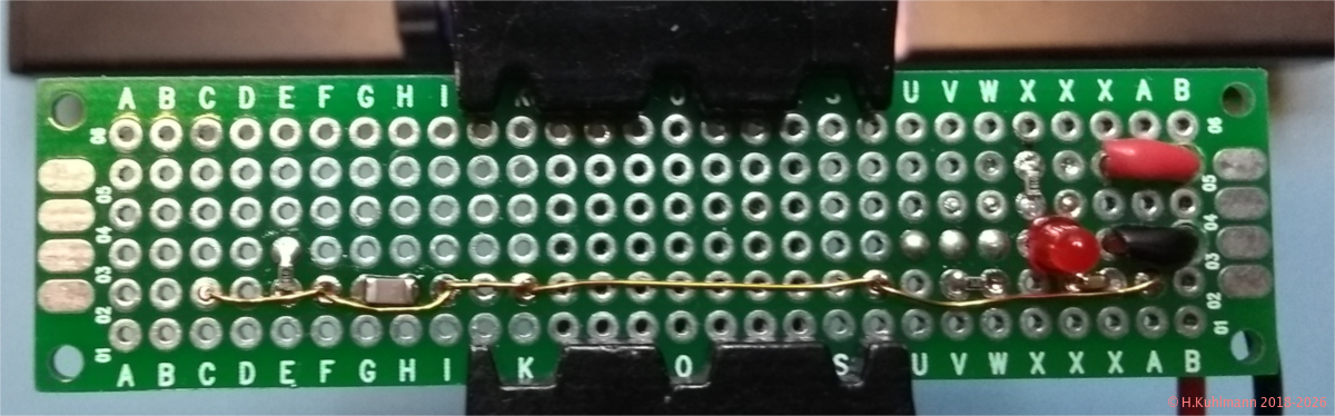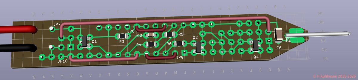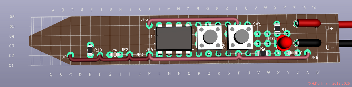 Der Impuls-Injektor kann auf einer kleinen Lochrasterplatine mit durchkontaktierten Lötinseln von 1,5 cm * 8 cm aufgebaut werden. Das Layout geht von einer 2 cm * 8 cm großen Platine aus. Sie wird nach der Bestückung an beiden Seiten längs beschnitten und vorne abgeschrägt.