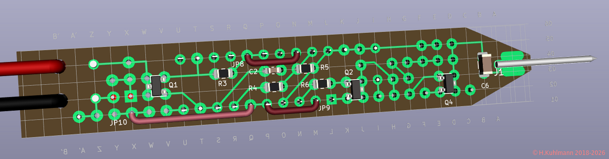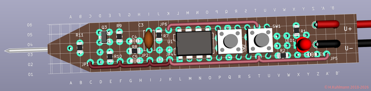 Q1 verhindert Schäden bei Verpolung der Versorgungsspannung. LED1 zeigt die Verpolung an. LED2 zeigt die korrekte Versorgungsspannung an und dient gleichzeitig zur Beleuchtung der Messspitze.