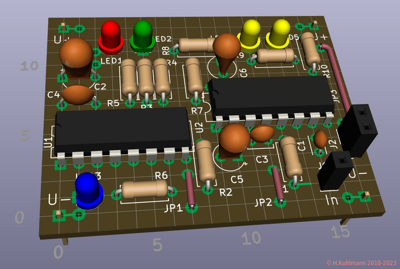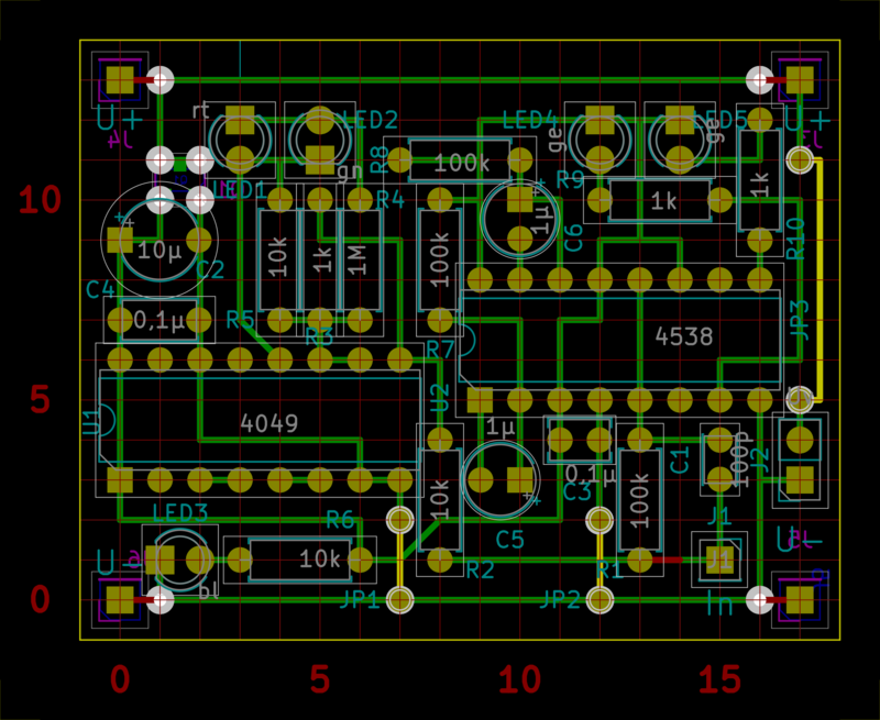 Es werden drei Drahtbrücken JP1 bis JP3 benötigt. Sie sind im Layout gelb dargestellt.