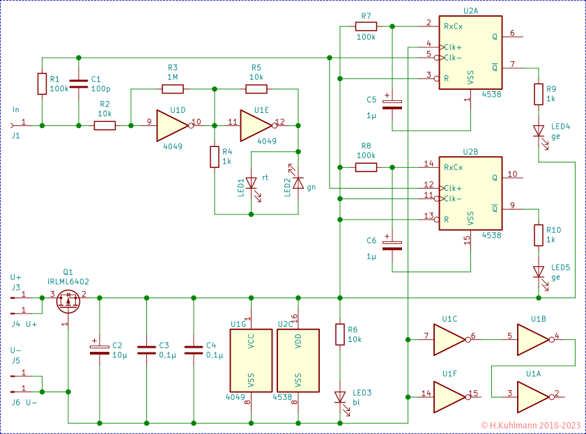 Rechts dienen zwei monostabile Multivibratoren U2A und U2B zur Impulserkennung. Der 74HC4538 wurde gewählt, weil beide Eingänge Schmitt-Trigger sind. Die Eingänge sind über R1 gegen fehlerhafte Spannungen geschützt. Der Kondensator C1 überbrückt R1 für schnelle Impulse.