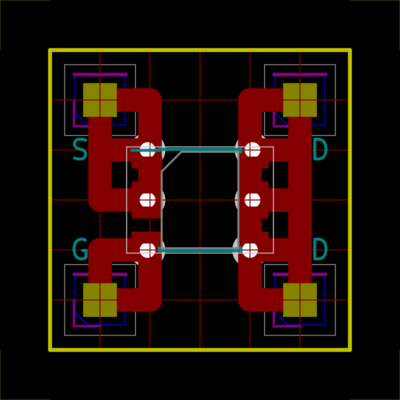 Die Leiterbahnen sind rot, die dünnen roten Linien sind das Raster. Die Lötpunkte für das SMD-Bauelement sind dargestellt.