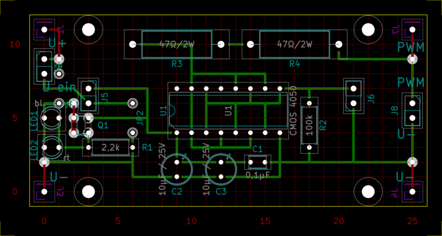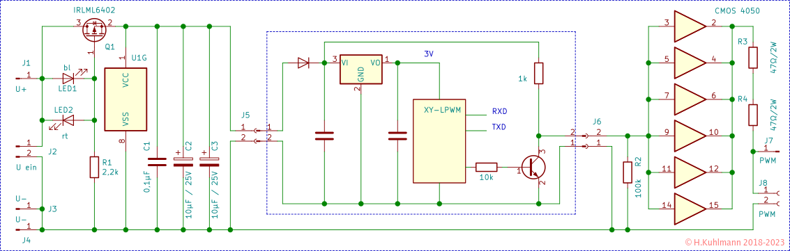 Der Ausgang des XY-LPWM wird durch einen CMOS 4050 verstärkt. Alle Gatter des 4050 sind parallel geschaltet. Zwei 47 Ω Widerstände schützen den 4050 vor Überlastung.