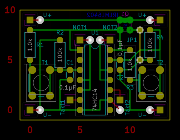 In der Draufsicht in Bild 3 sind die Verbindungen auf der Oberseite gut zu erkennen, insbesondere die diagonale Verbindung von Pin 9 des 74HC14.