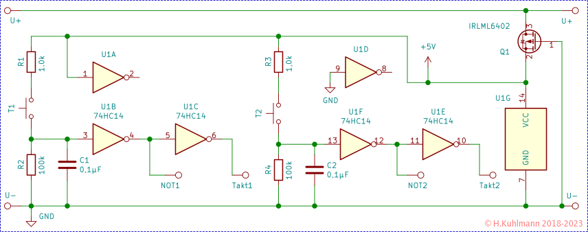 Die Schaltung entspricht der im Praktikum Entprellter Taster, Reset vorgestellten Variante mit Schmitt-Trigger. Zusätzlich sind invertierte Ausgänge vorhanden.