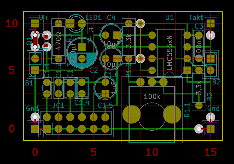Der Taktgenerator ist für Spannungen zwischen 3 V und 6 V ausgelegt. Durch den MOSFET Q1 ist er gegen Verpolung geschützt. Der Ausgang des Timers ist nicht hochbelastbar (CMOS).