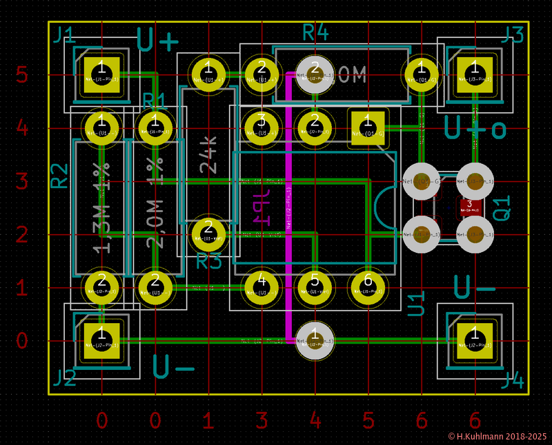 Der MOSFET IRLML6402 hat ein SMD-Gehäuse SOT-23-3, der MCP65R41 ein SOT-23-6. Die Montage dieser SMD-Gehäuse auf Lochrasterplatinen ist unter SOT-Gehäuse beschrieben. Der IRLML6402 kann direkt auf die Lochrasterplatine montiert werden. Für das 6-polige SOT-23-6 des MCP65R41 ist es einfacher, einen Adapter zu verwenden. Im Layout in Bild 2 ist der MCP65R41 mit dem Adapter als DIL-6-Gehäuse dargestellt.