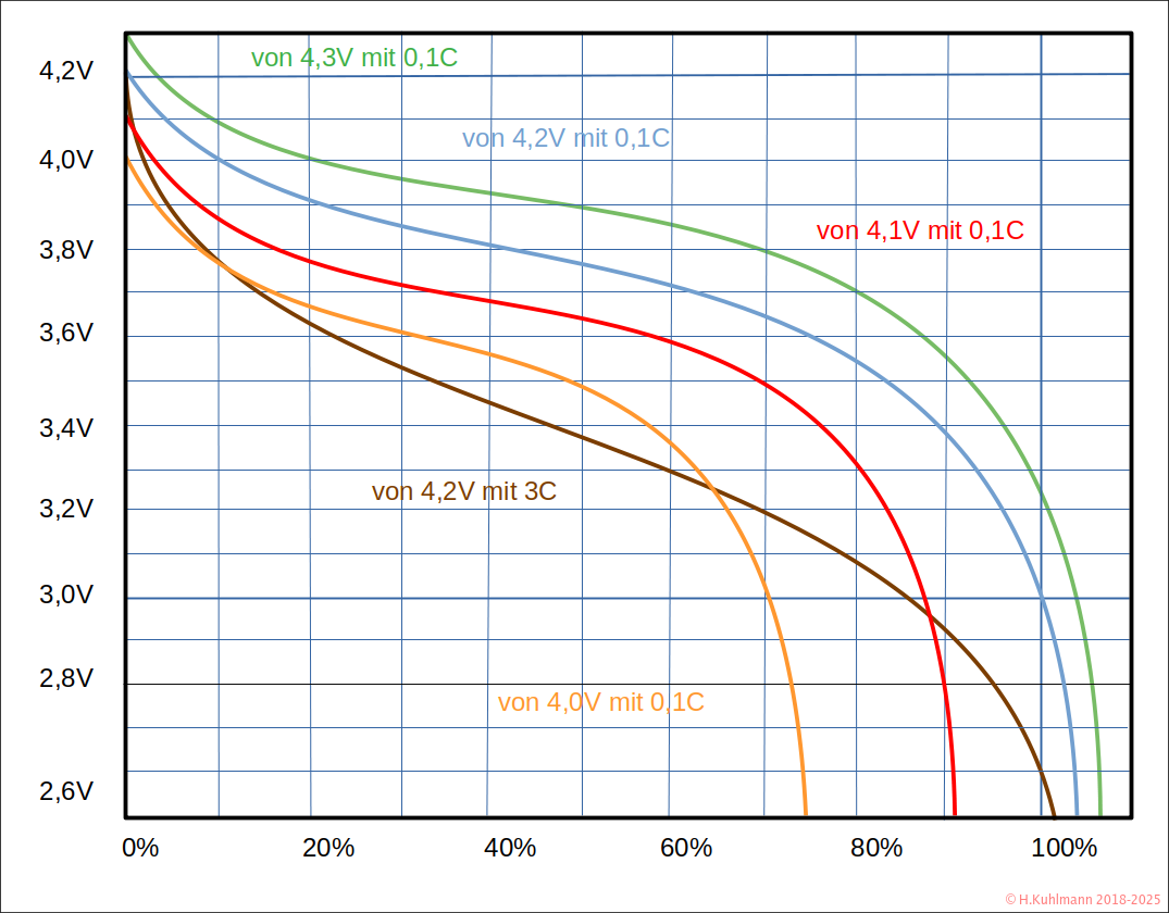 Die braune Kurve zeigt den typischen Verlauf der Akkuspannung bei stärkerer Entladung mit 3 C. Die Ladeschlussspannung beträgt 4,2 V. Die Spannung fällt mit zunehmender Entladung steiler ab als bei 0,1 C, zeigt allerdings gegen Ende einen flacheren Verlauf. Bei 3 V werden nicht ganz 90 % der Akkukapazität ausgenutzt. Eine Ausnutzung von 100 % wird erst bei einer Akkuspannung von 2,6 V erreicht.