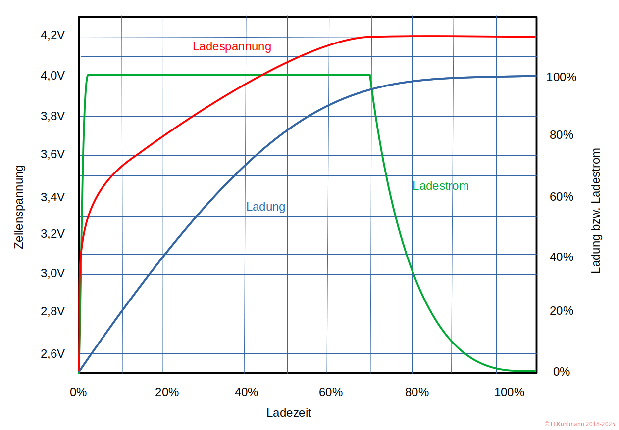 Zu Beginn wird der Akku mit einem konstanten Strom geladen. Wenn die Spannung von 4,2 V erreicht ist, wird mit einer konstanten Spannung von 4,2 V geladen. Während des Ladens mit Konstantstrom steigt die Ladespannung kontinuierlich an. Wird auf die Konstantspannung umgeschaltet, sinkt der Ladestrom mit der Zeit ab. Wenn der Ladestrom einen bestimmten Wert unterschreitet, gilt der Ladevorgang als beendet.