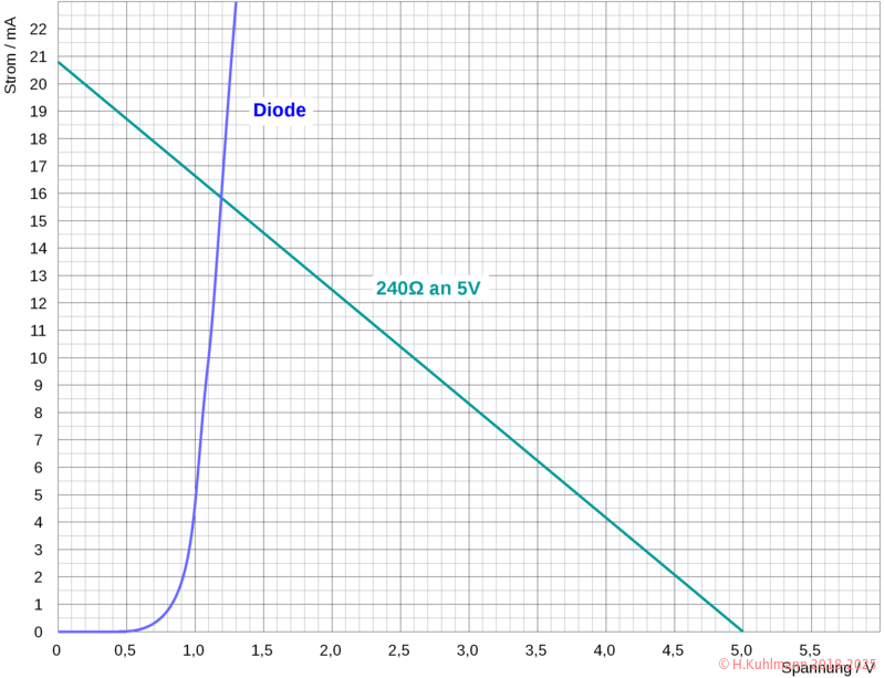 - der Punkt (U, I) z. B. (5 V, 5 mA) wird im Kennlinienfeld markiert und