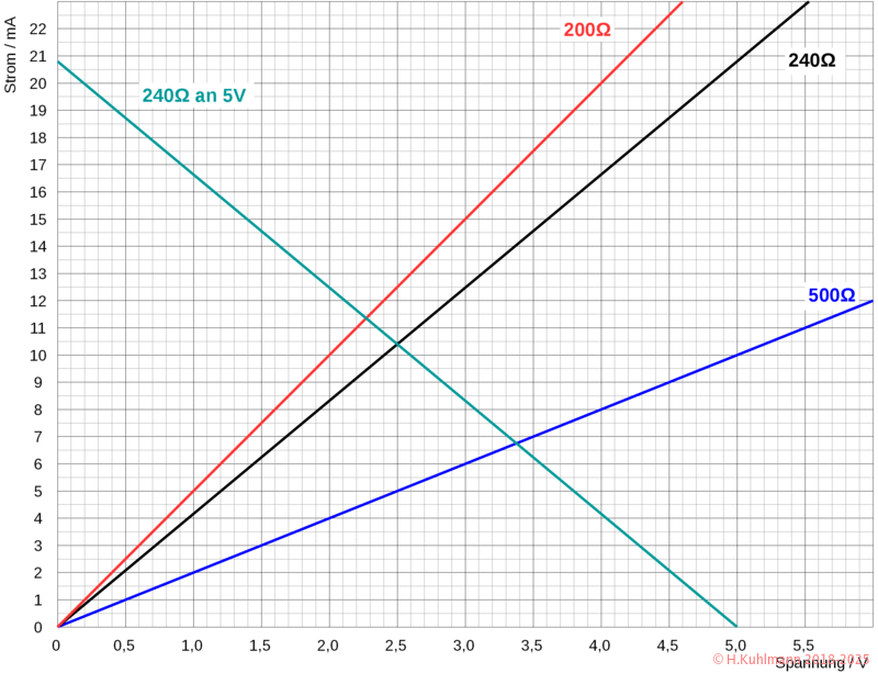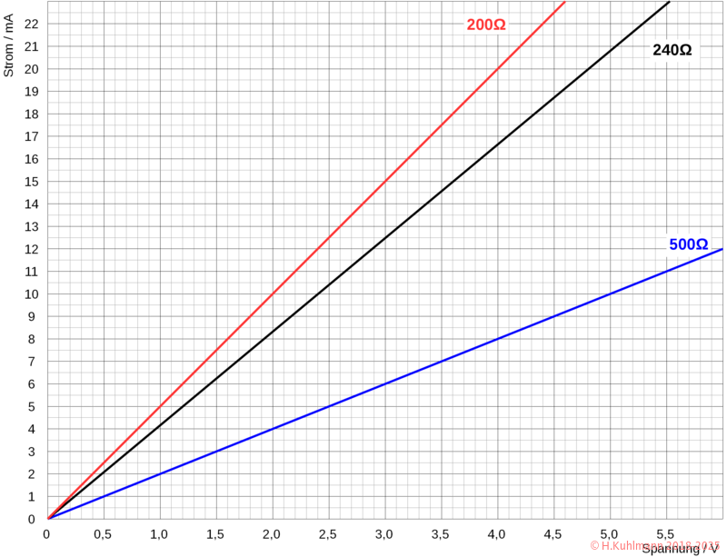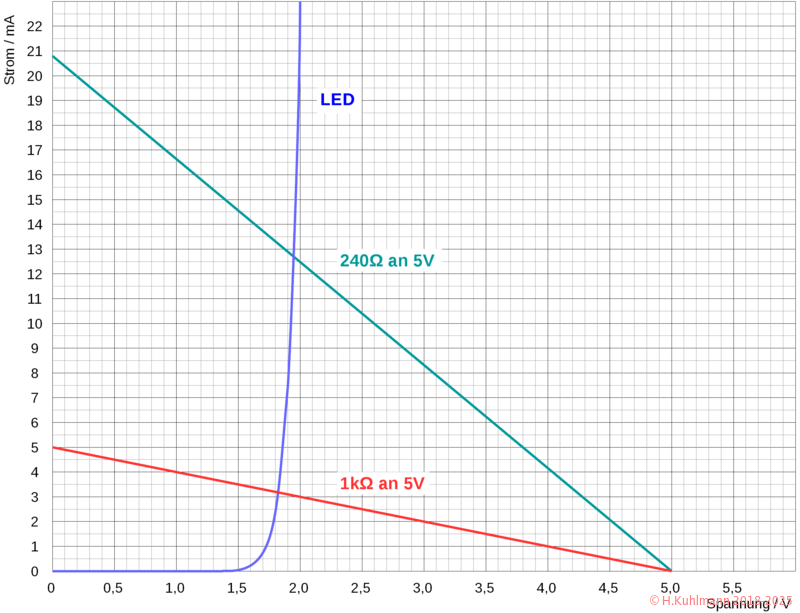 - wird der Strom für einen Widerstand (z. B. 1 kΩ) berechnet: I=5 V/1 kΩ=5 mA,