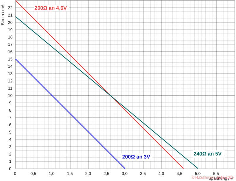 In Bild 8 sehen wir erneut die Kennlinie für eine 5 V-Spannungsquelle mit einem 240 Ω-Vorwiderstand (grün).