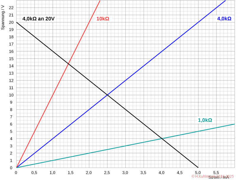 In Bild 6 sind die Kennlinien für drei Widerstände eingetragen. Im Gegensatz zu Bild 5 verlaufen die Kennlinien bei kleineren Widerstandswerten flacher. Aber wie in Bild 5 schneiden sich die Kennlinien für einen Widerstand von 4 kΩ an einer Spannungsquelle von 20 V und einer Last von 4 kΩ bei der halben Spannung von 10 V und dem halben Strom von 2,5 mA.