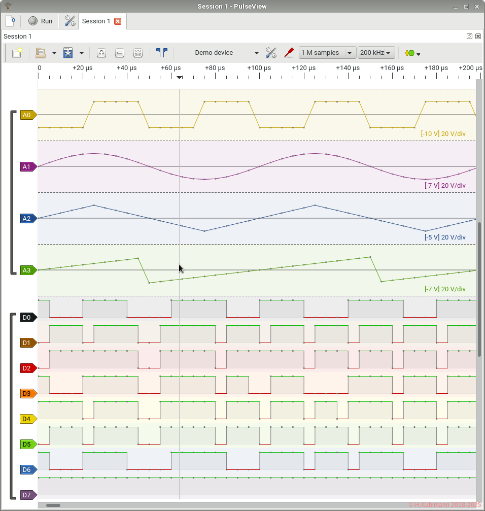Wir haben noch kein Gerät angeschlossen, aber PulseView hat ein Demo-Device.