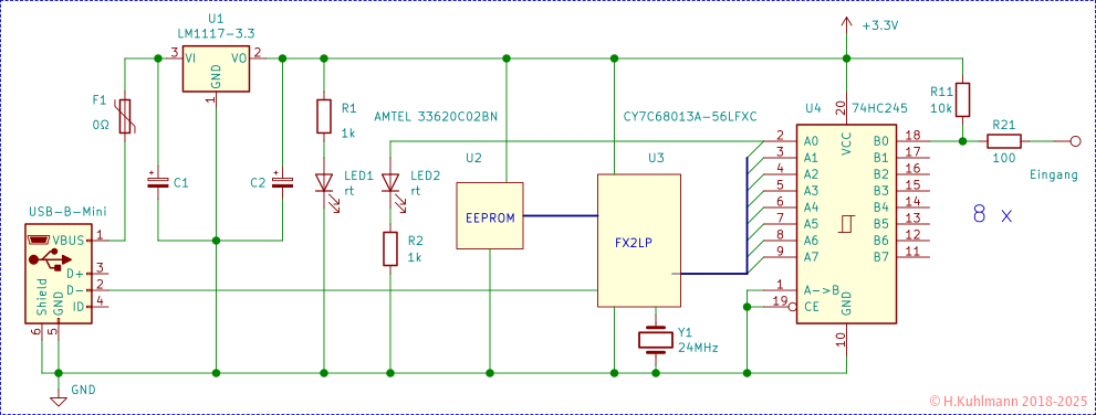 Über das I²C-Interface wird das Programm des FX2LP aus einem EEPROM geladen.